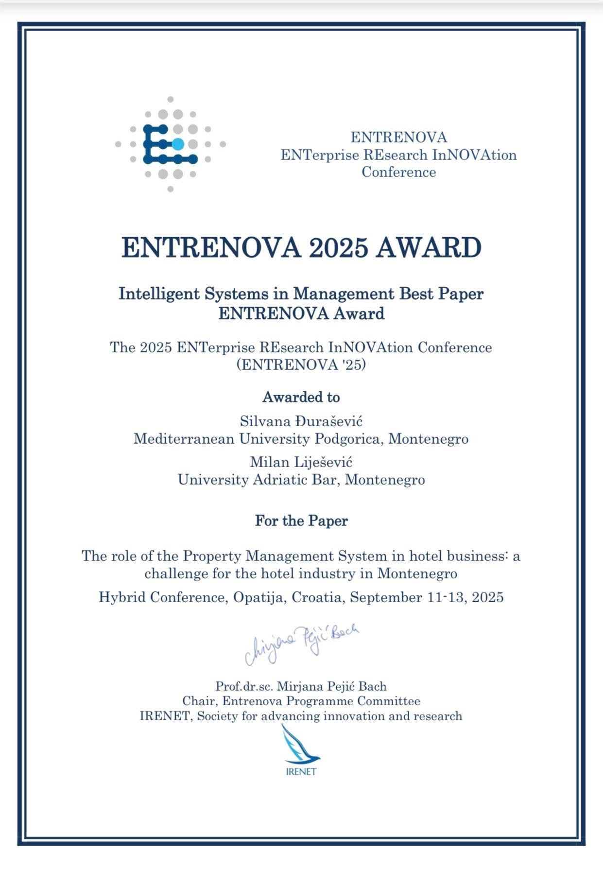 Rad je odnio titulu “Intelligent Systems in Management Best Paper ENTRENOVA Award 2025”.