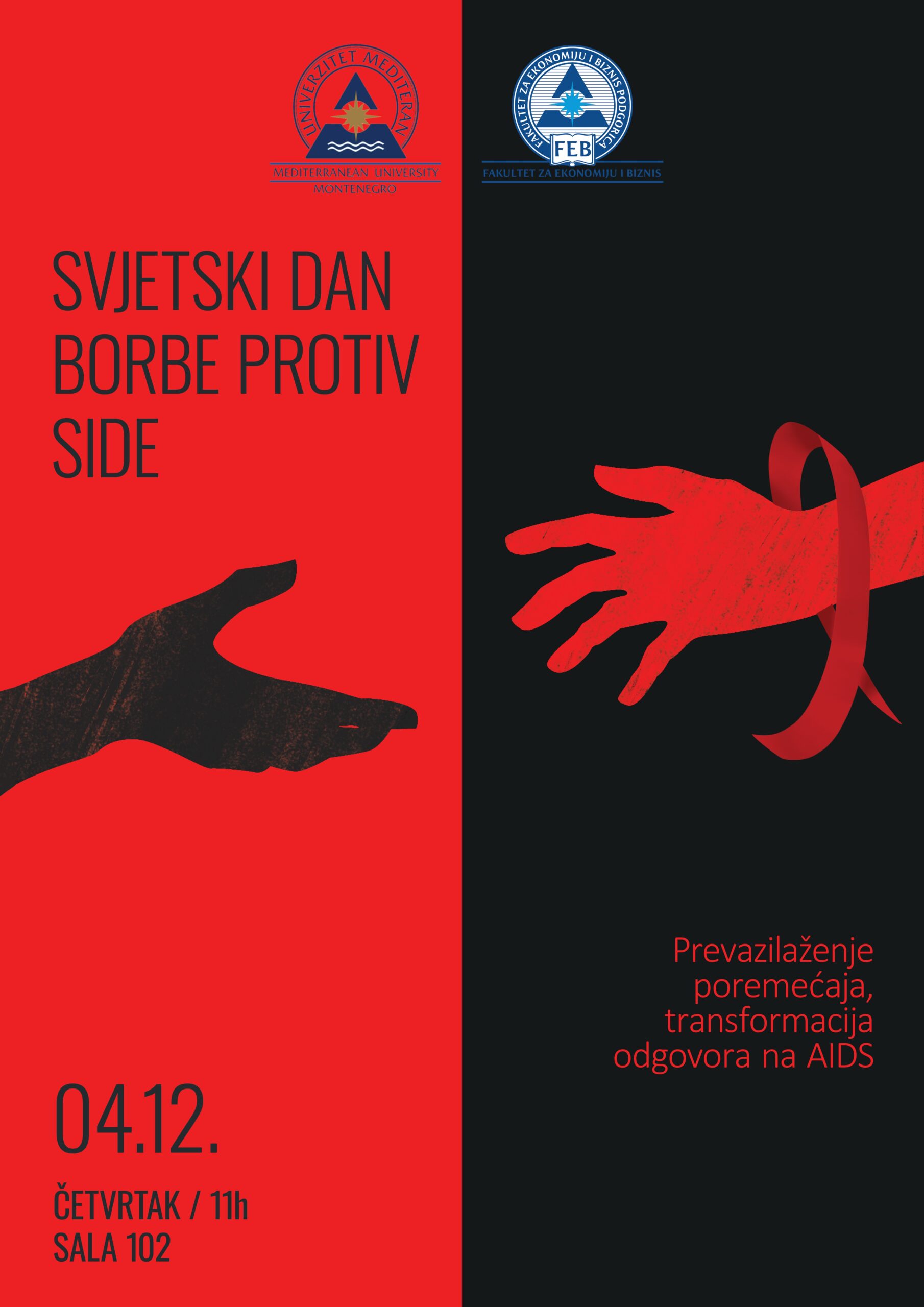 Povodom 1. decembra – Svjetskog dana borbe protiv side, koji se ove godine obilježava pod sloganom „Prevazilaženje poremećaja, transformacija odgovora na AIDS“, organizuje se edukativno gostujuće predavanje posvećeno podizanju svijesti o HIV infekciji, prevenciji i destigmatizaciji oboljelih.